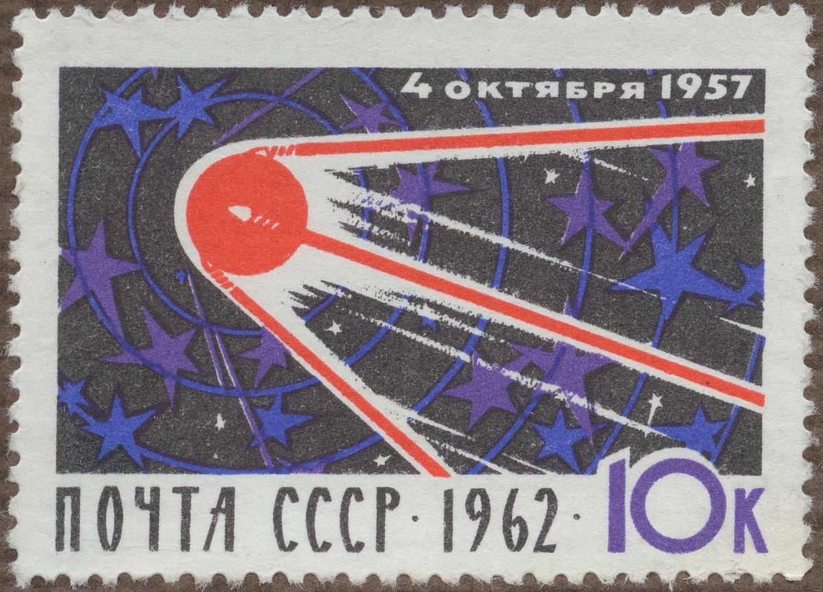 Frimärke från Ryssland, 1962. Motiv av "Sputnik I": Sovjets artificiella satellit: första i världen d. 4 oktober 1957. 5-årsminne: 1957-1962