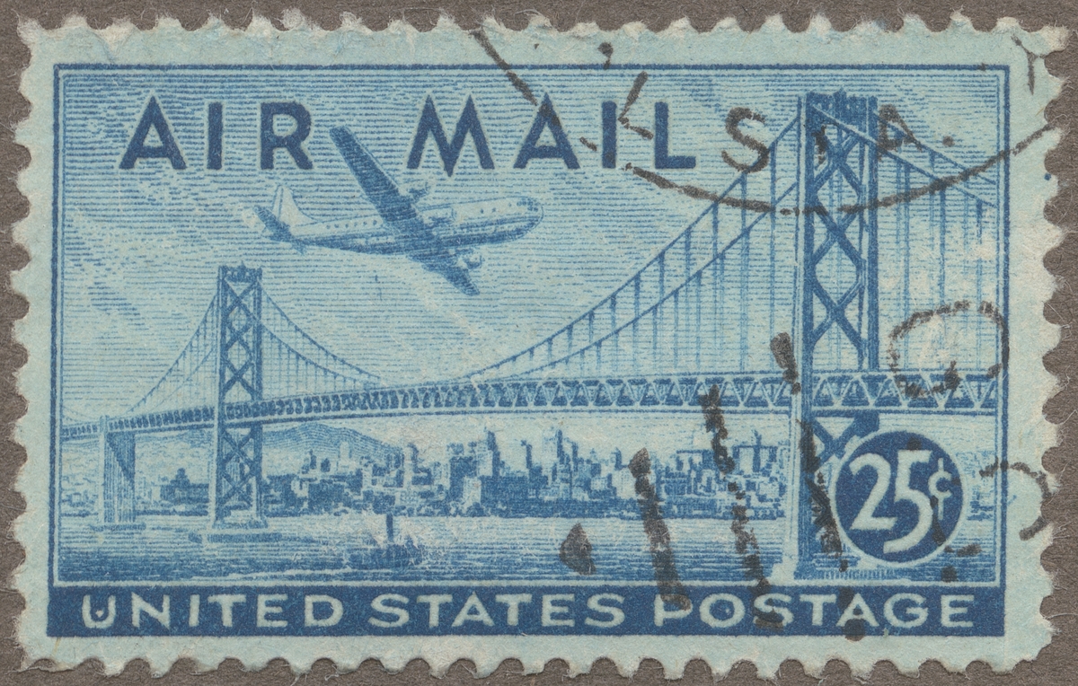 Frimärke från U.S.A., 1947. Motiv av Fyrmotorigt monoplan över hängbron: San Francisco- Oakland Bay.