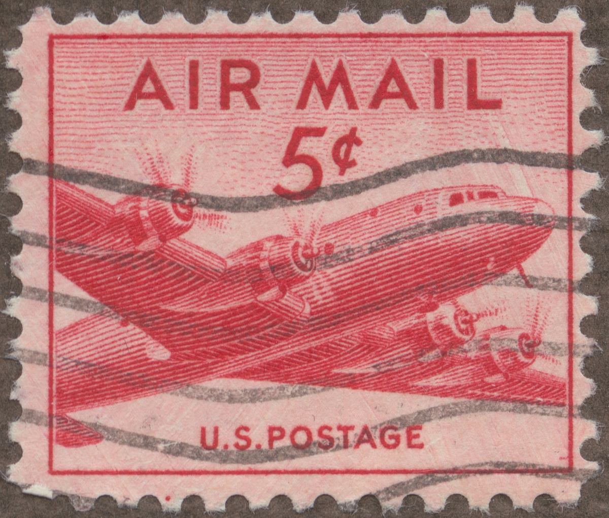 Frimärke från U.S.A., 1947. Motiv av Fyrmotorigt monoplan amerikanskt av typ: Douglas DC-4 Skymaster.