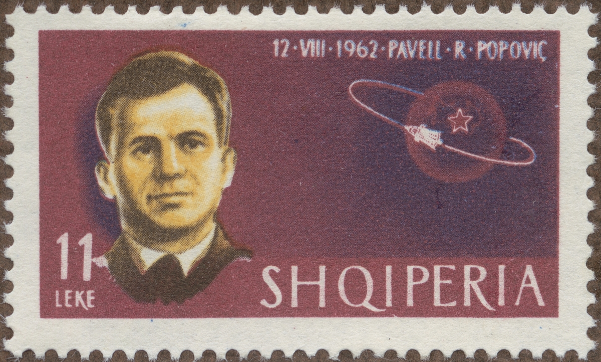 Frimärke från Albanien, 1963. Motiv av Rymdresa: 12 augusti 1963: Ryssen Pavel R. Popovic. "-Astronaut Serie-"
