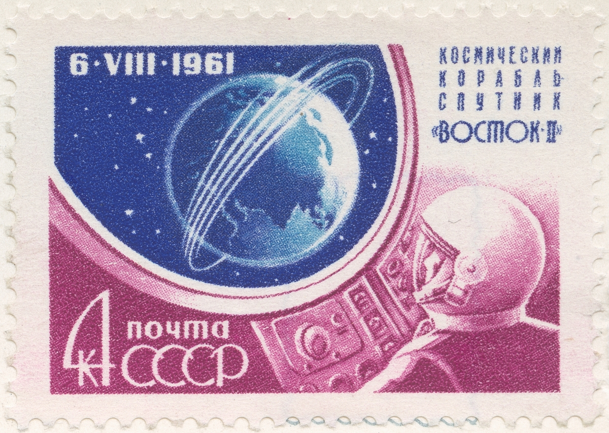 Frimärke från Ryssland, 1961. Motiv av Rymdskeppet: Sputnik "Wostok":s resa runt jorden 6-7 augusti 1961. (nedan): Rymdpiloten Major G.S Titov i Wostok