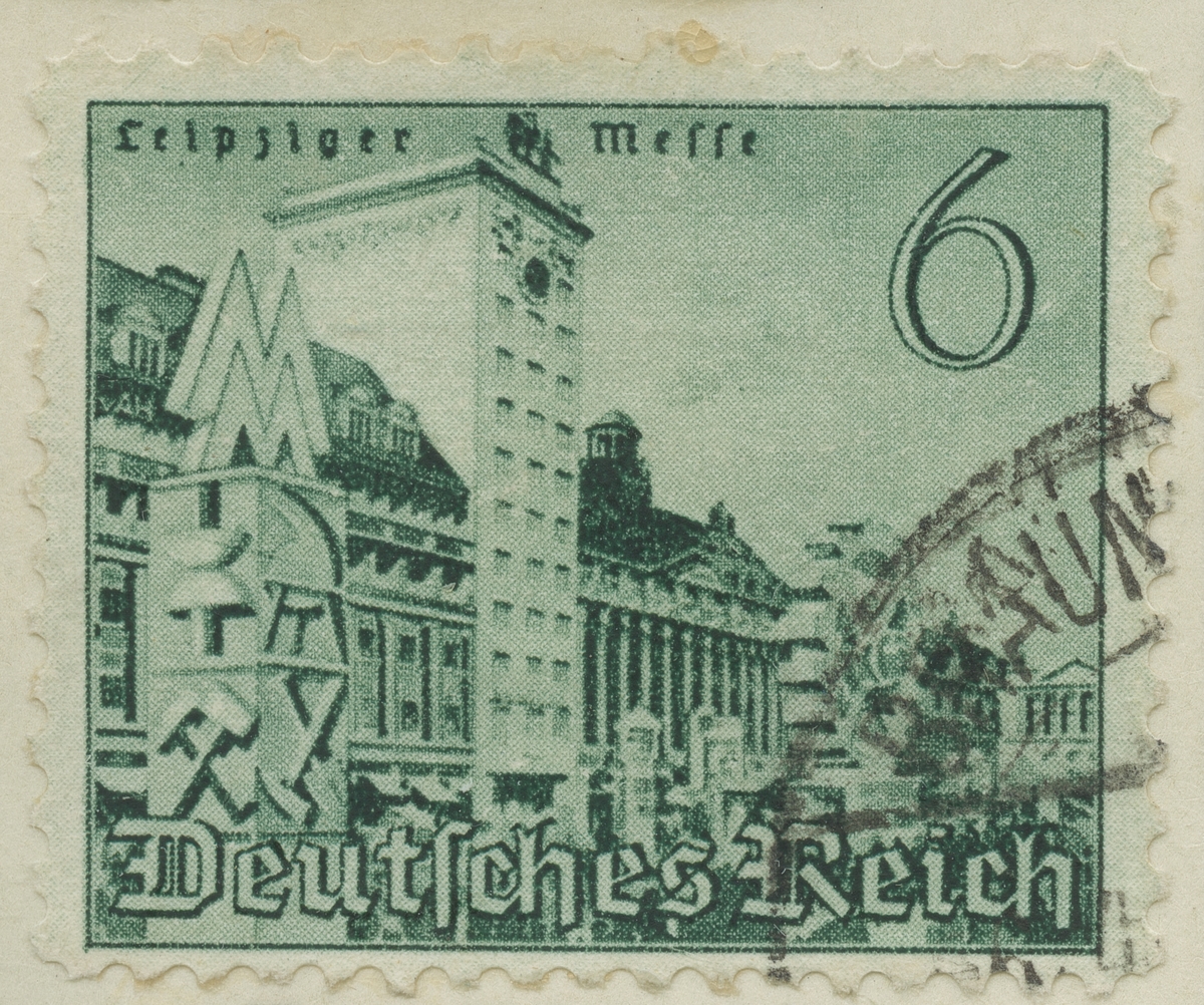 Frimärke från Tyskland, 1939. Motiv av Bokhandels Mässa i Leipzig Augustus Platz 1939