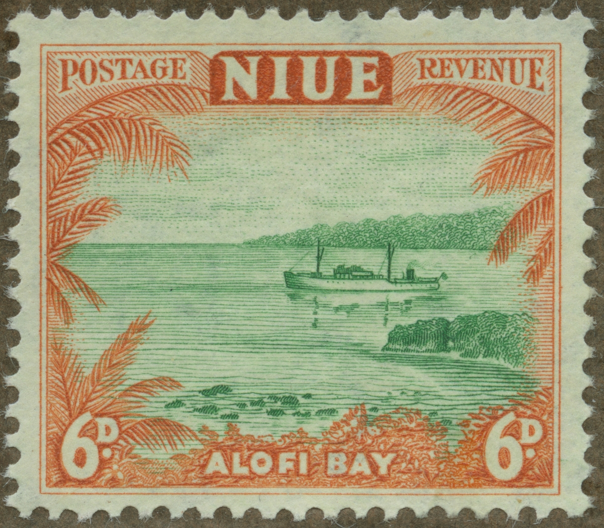 Frimärke från Niue, 1950. Motiv av Alofi - Bukten