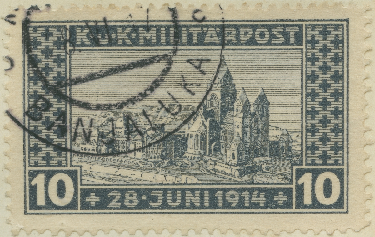 Frimärke från Bosnien Herzegovina, 1917. Motiv av arktitektmodell för Minneskyrka i Sarajevo. "Minne av attentatet 28 juni 1914 på ärkehertigparet Fernand och Sophia, vilket gav anledning till världskrig I". "Till förmån för kyrkans byggnadsfond".