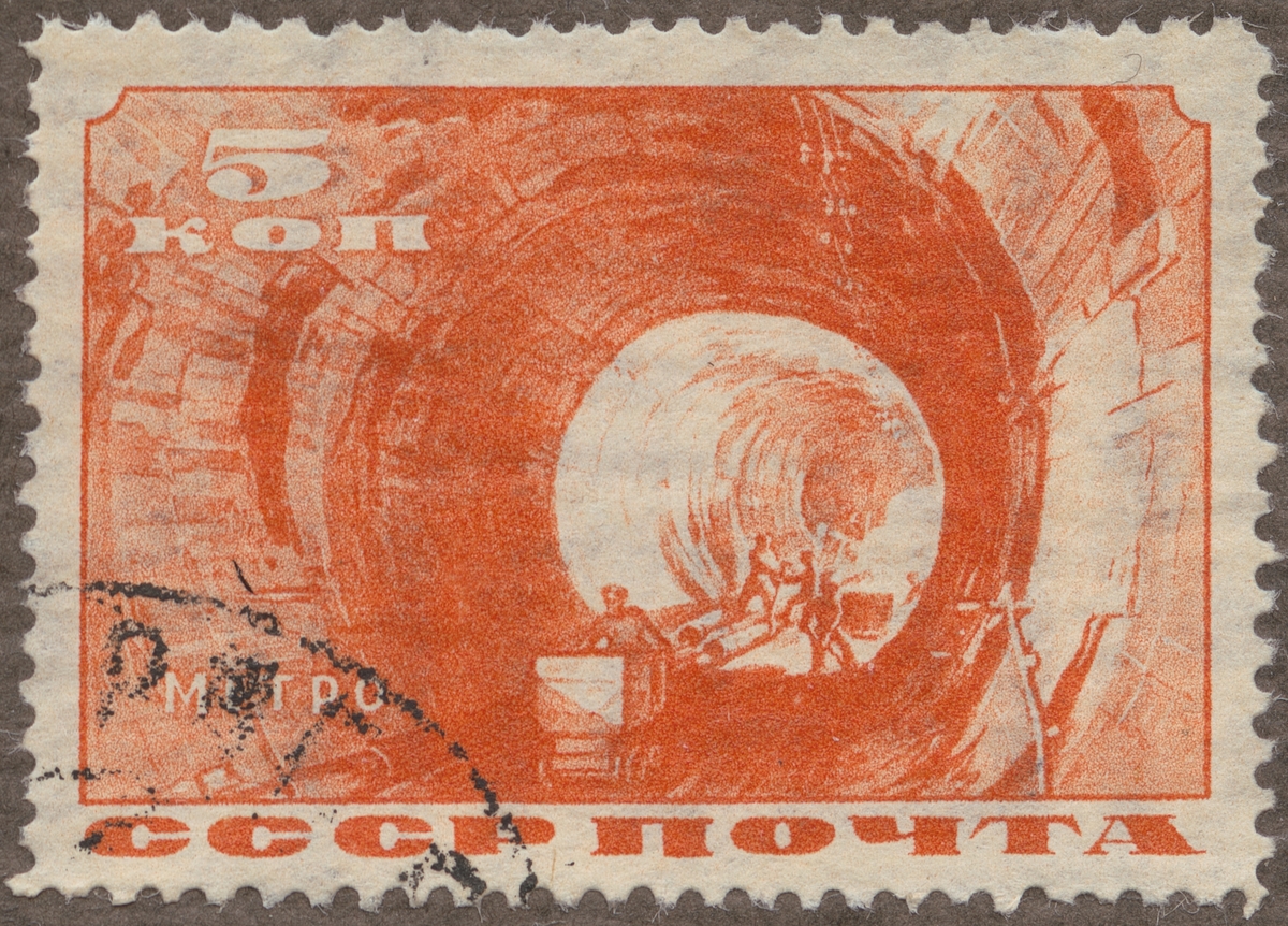 Frimärken ur Gösta Bodmans filatelistiska motivsamling, påbörjad 1950. Frimärke från Ryssland, 1935. Motiv av Ryskt tunnelbygge för Metrobanan i Moskwa. "Minne om tunnelbyggets slutföring 1935:"