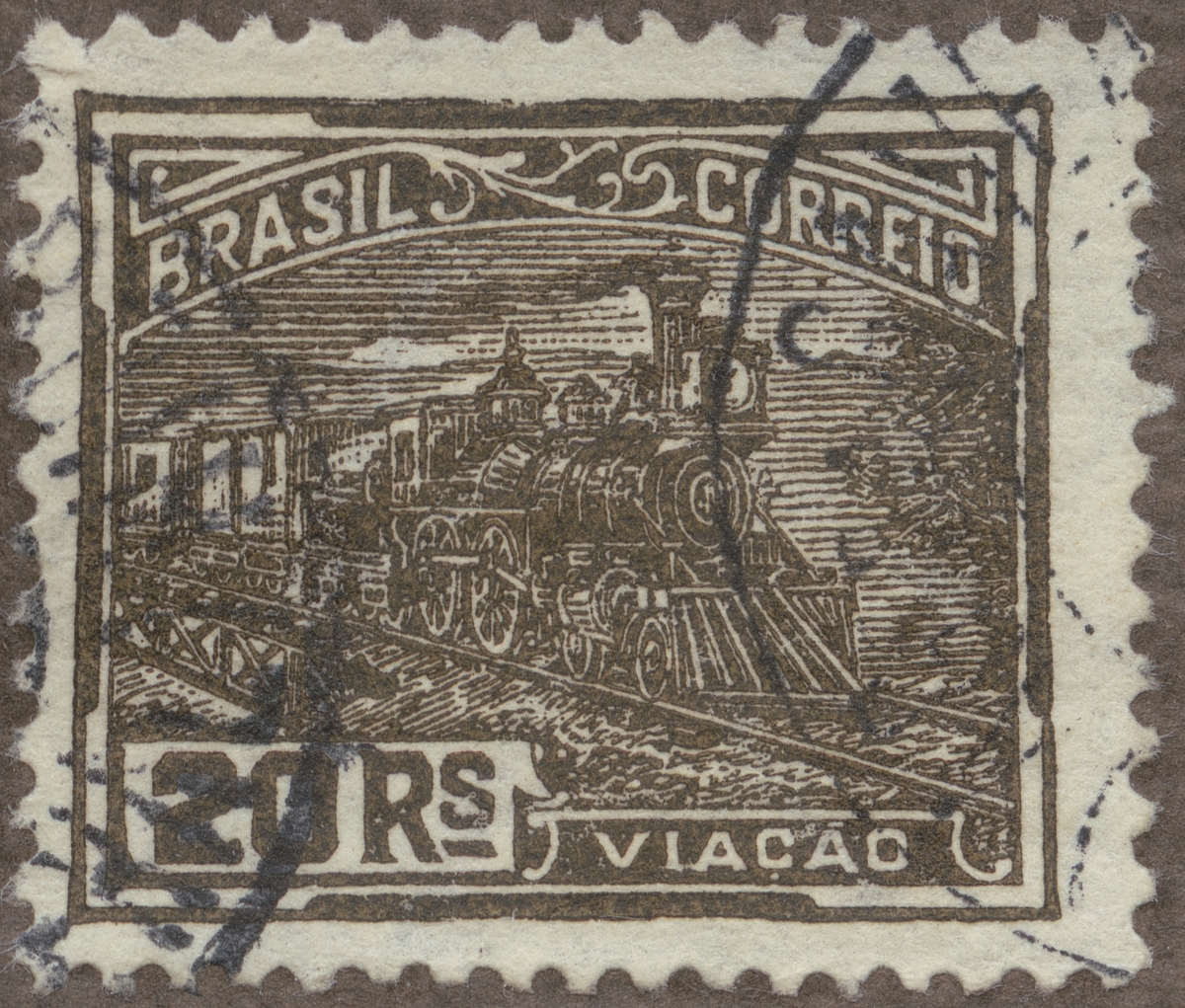 Frimärken ur Gösta Bodmans filatelistiska motivsamling, påbörjad 1950. Frimärke från Brasilien, 1920. Motiv av Brasilianskt lokomotiv med typisk "kofångare"