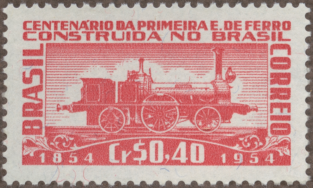 Frimärken ur Gösta Bodmans filatelistiska motivsamling, påbörjad 1950. Frimärke från Brasilien, 1954. Motiv av Brasilianskt ånglok av år 1854 "Brasiliens järnvägar 100 år 1854-1954."