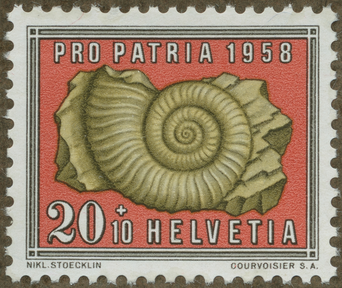 Frimärke ur Gösta Bodmans filatelistiska motivsamling, påbörjad 1950. Frimärke från Schweiz, 1958. Motiv av Ammonit "Nautilus' föregångare Pro Patria serien 1958"