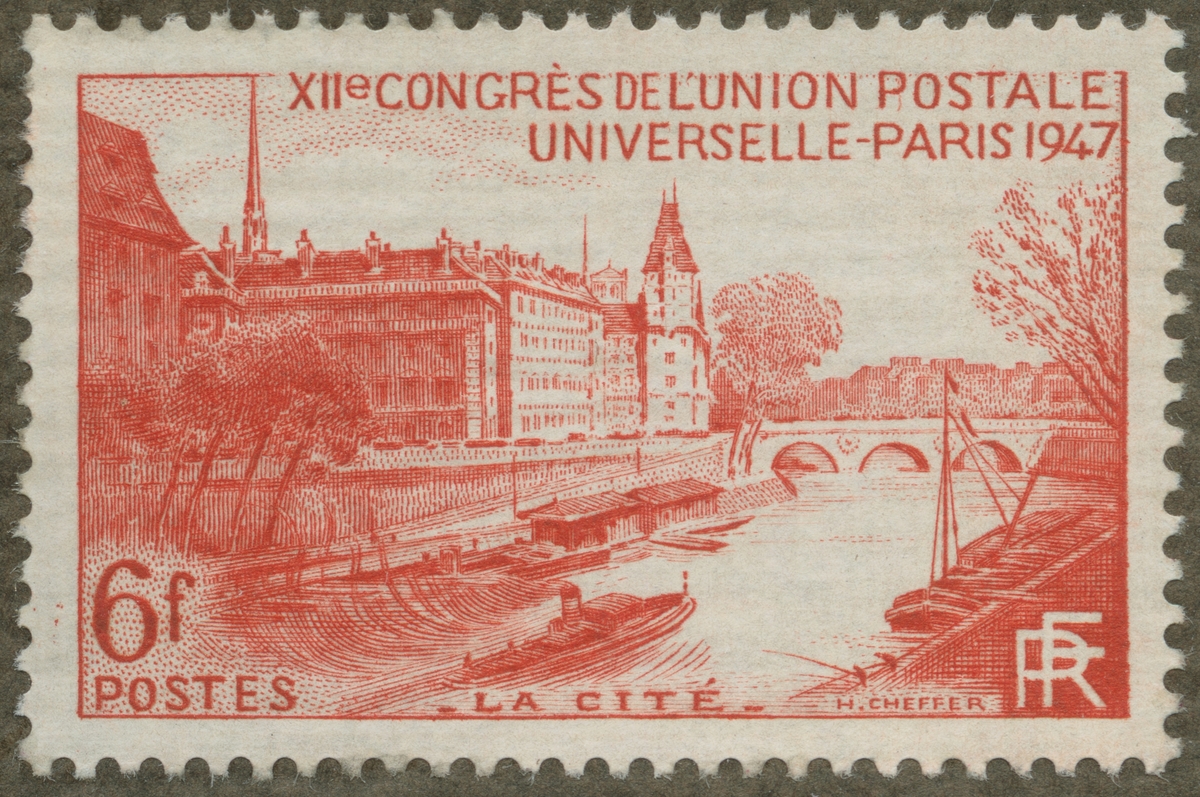 Frimärke från Frankrike, 1947. Motiv av Bron till La Cité i Paris 12,te internat. postkongressen