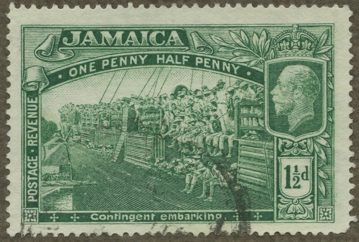 Frimärke från Jamaica, 1919. Motiv av Embarkering av militär i Jamaica: världskrig I.- (t.h.): Kung George V.-