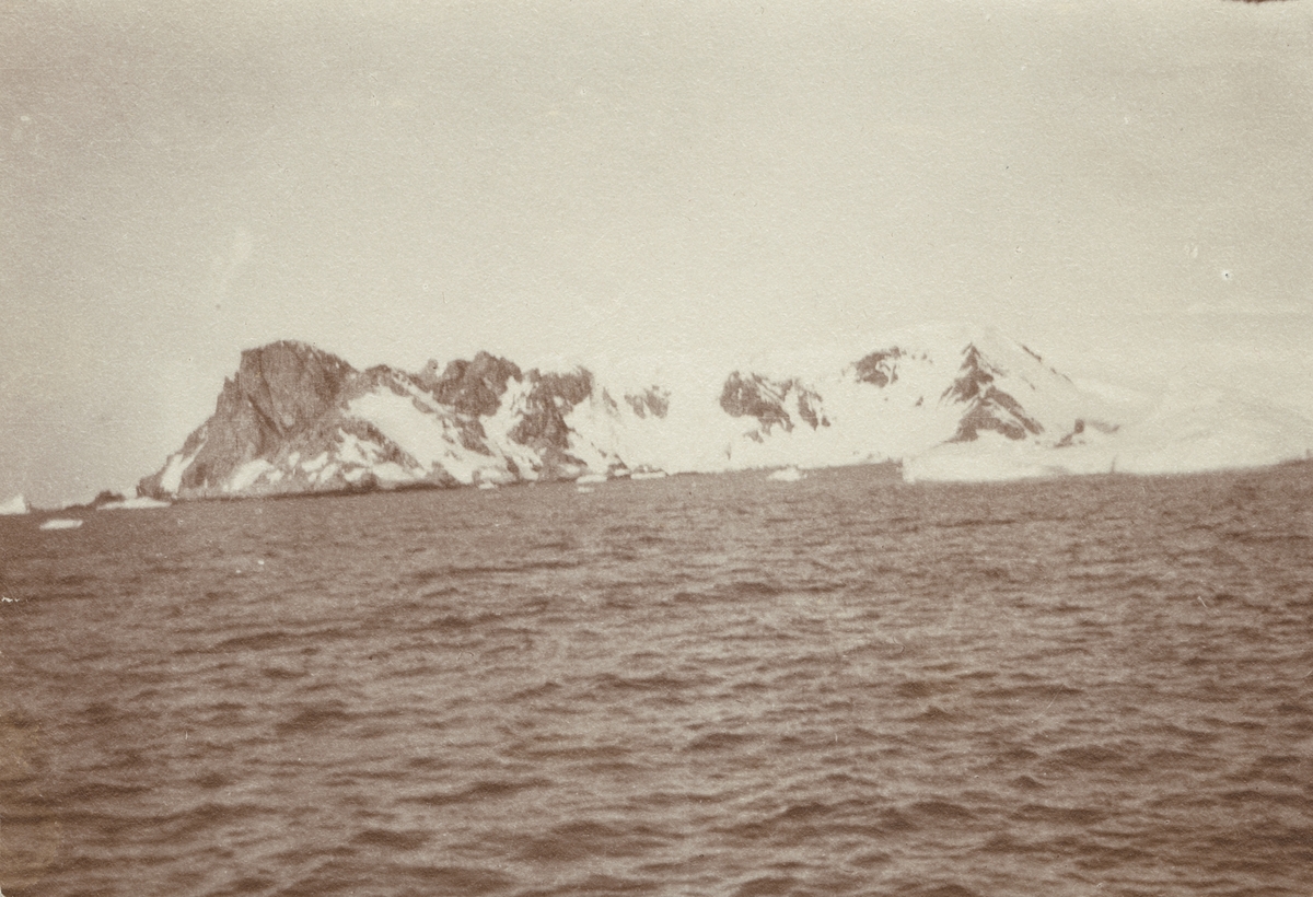 Fotografi från första svenska Antarktisexpeditionen 1901-1904. Vy över hav och snötäckt berg.