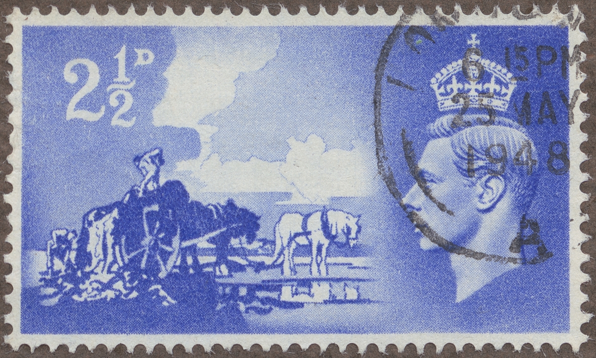 Frimärke från England, 1948. Motiv av upptagandet av tång på ön Jersey, en av de engelska Normadiska öarna. T.h. Kung George VI.