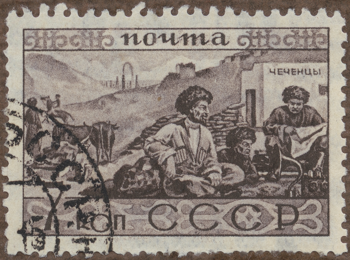 Frimärke från Ryssland, 1933. Motiv av petroleumfält. "I bakgrunden Tjetjener, ett nordkaukasiskt folk. Serie: Folkslag i Sovjetunionen".