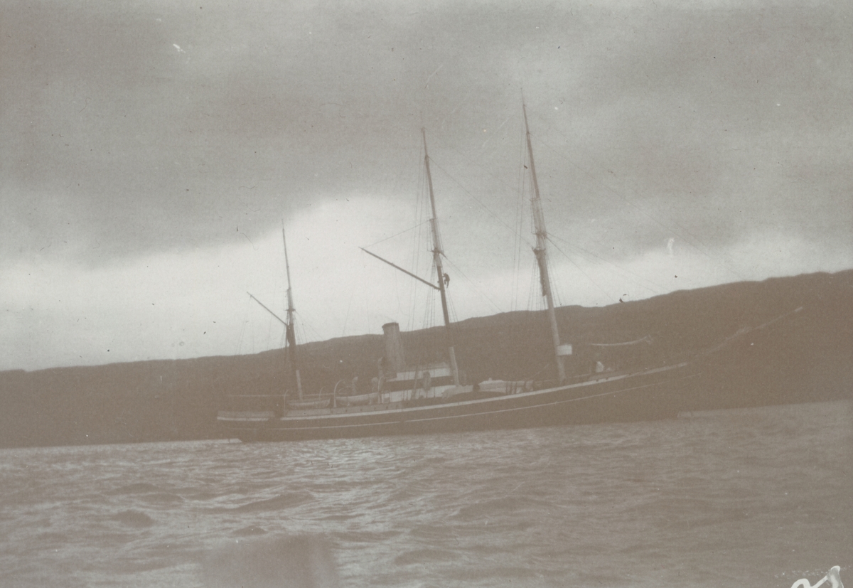 Fotografi från expedition till Grönland. Motiv av stort fartyg med tre master. Fartyget befinner sig på havet med berg i bakgrunden.