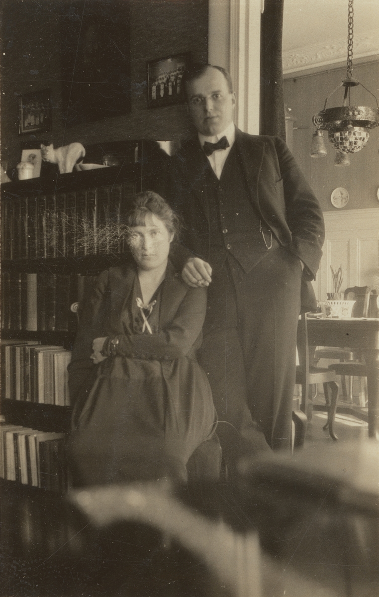 Fotografi från expedition till Spetsbergen. Motiv av man och kvinna som poserar inomhus framför en bokhylla.