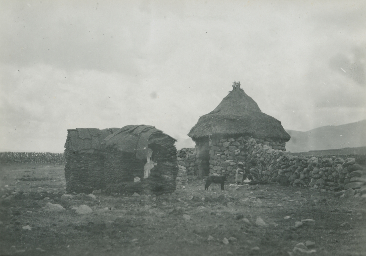 Fotografi från expedition till Peru 1920. Motiv av två stenhyddor med halmtak. Utanför ena hyddan finns en vuxen och två barn och en hund.