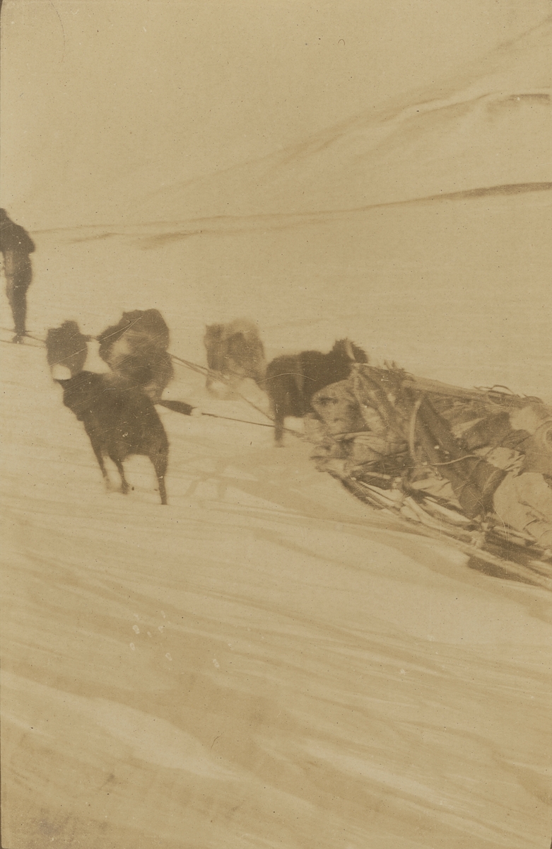 Fotografi från expedition till Spetsbergen. Motiv av hundspann i ett snölandskap.