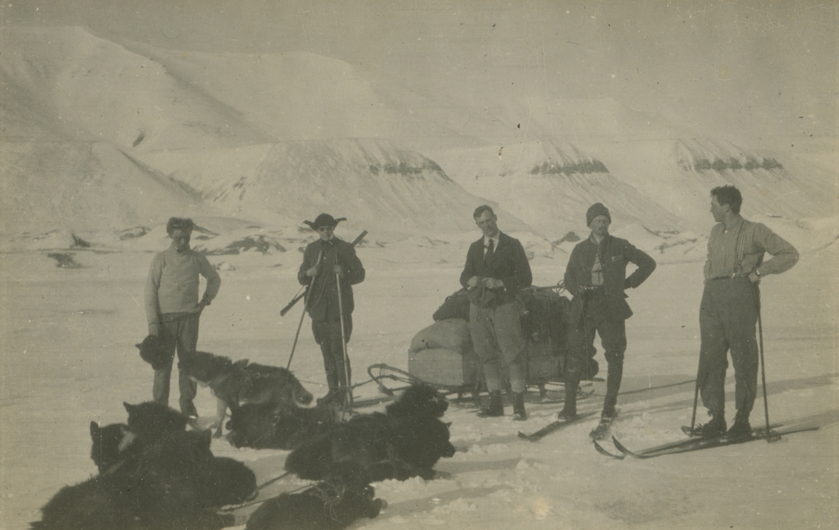 Spetsbergen övriga bilder. Motiv av fem män och ett hundspann i ett snötäckt bergslandskap, 1918-1919.