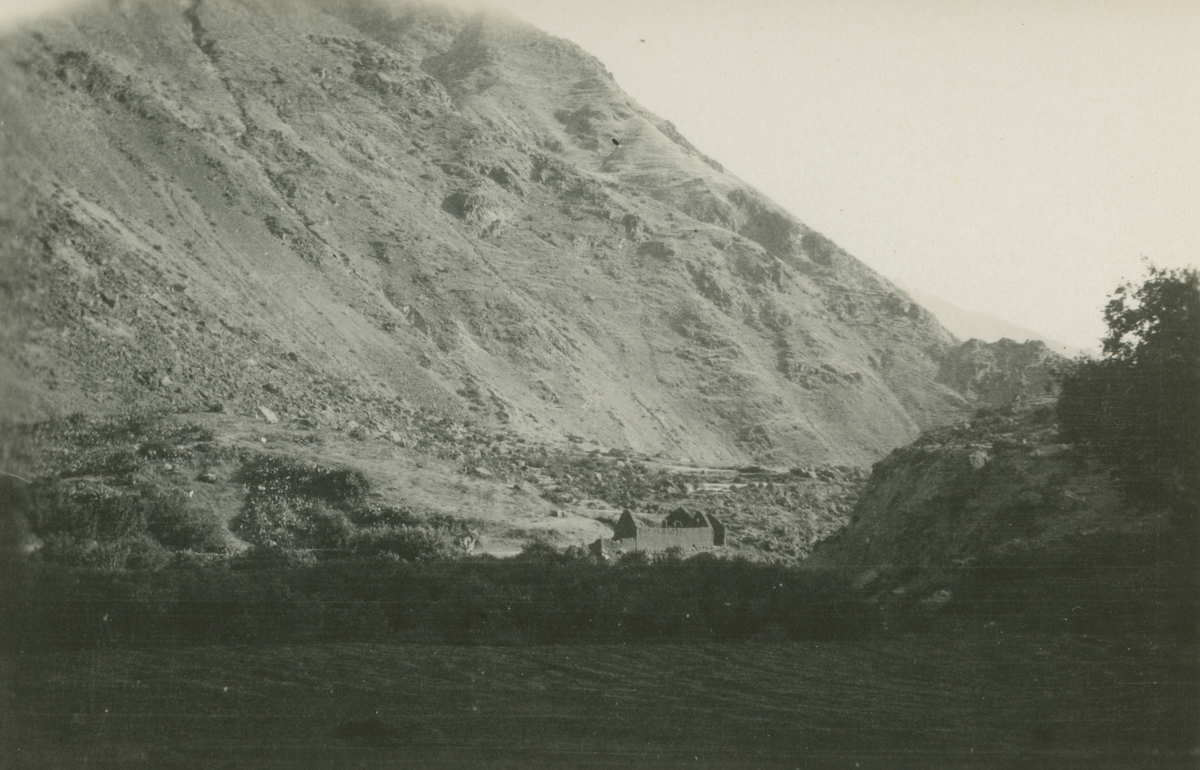 Fotografi från expedition till Peru 1920. Vy över berg. Vid foten av berget ligger ett hus.