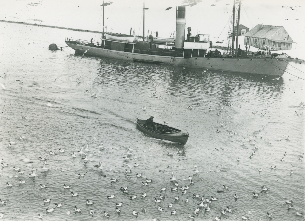 Bild från expedition i Antarktisområdet. Motiv av båtar och fågelflock i havet.