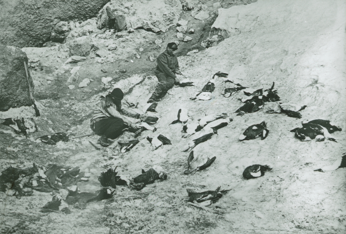 Fotografi från Grönland. Motiv av två män som dödat ett flertal pingviner.