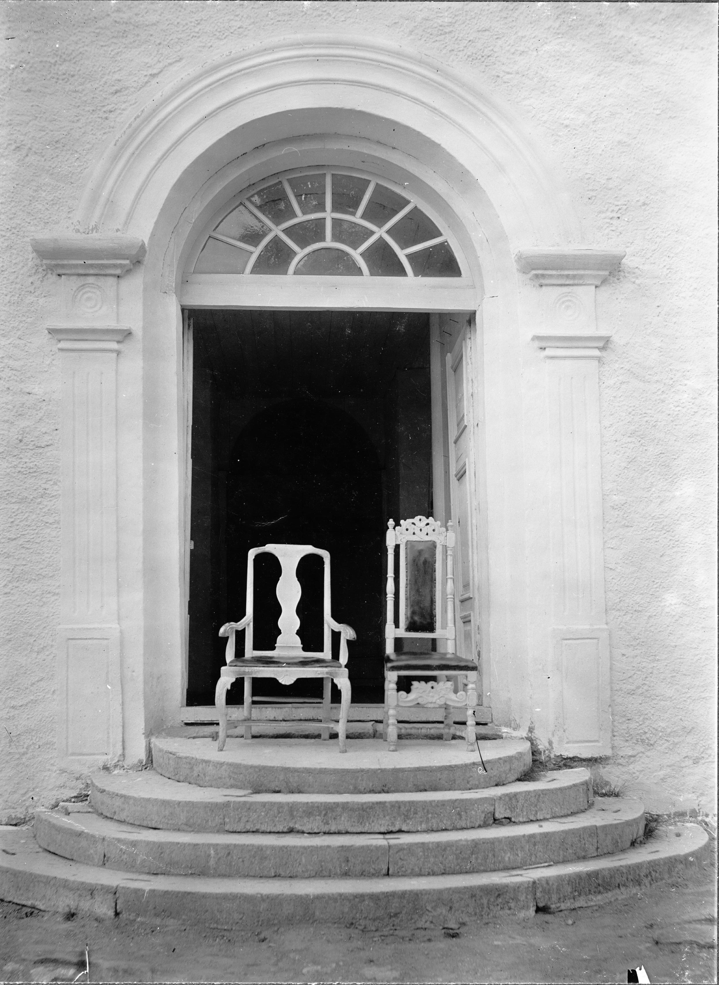 Karmstol, engelsk typ, 1700-talets början; Stol, vitmålad furu, högryggad, sniderier, 1600-talets slut