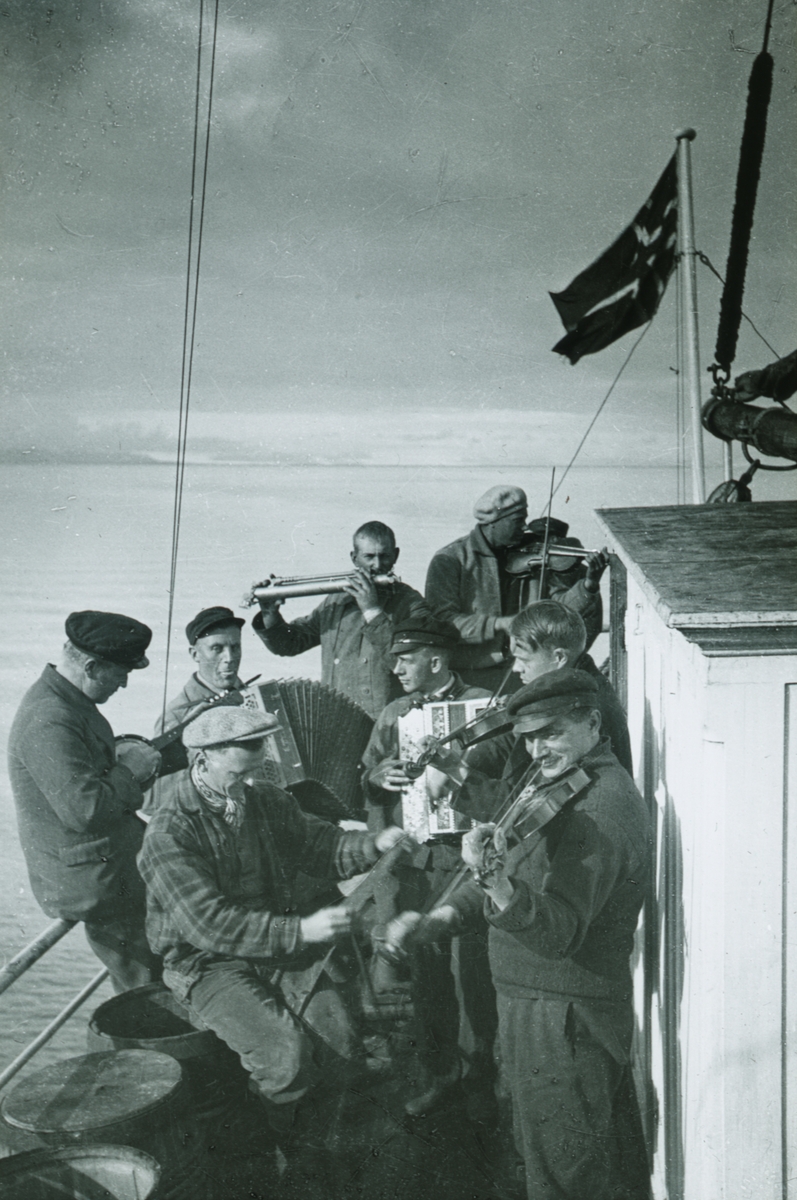 Glasnegativ med motiv av fartygsbesättning som spelar musik på däck.