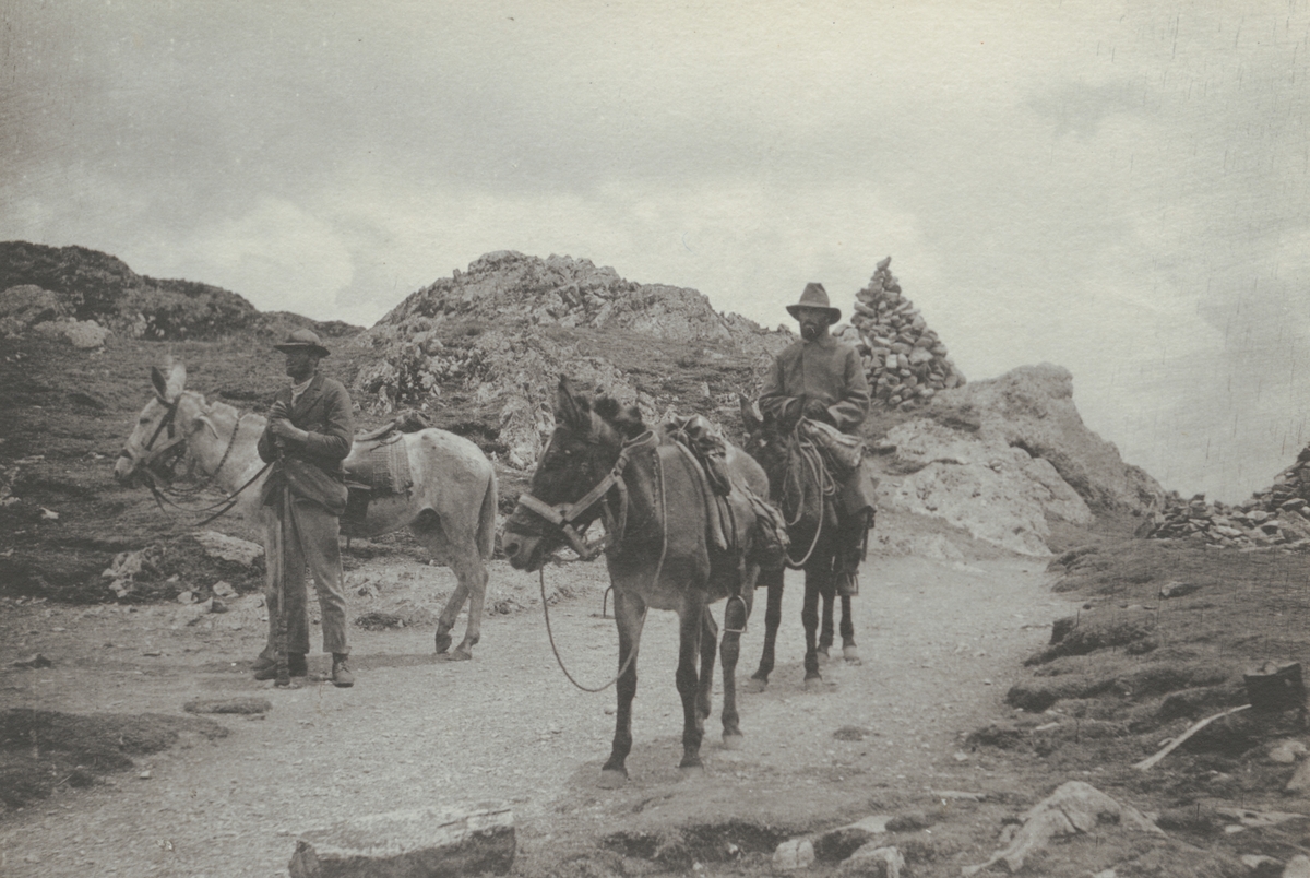 Fotografi från kuvert märkt med "Ernst Nordenskjöld". Motiv av två män och tre hästar på grusväg i bergslandskap.