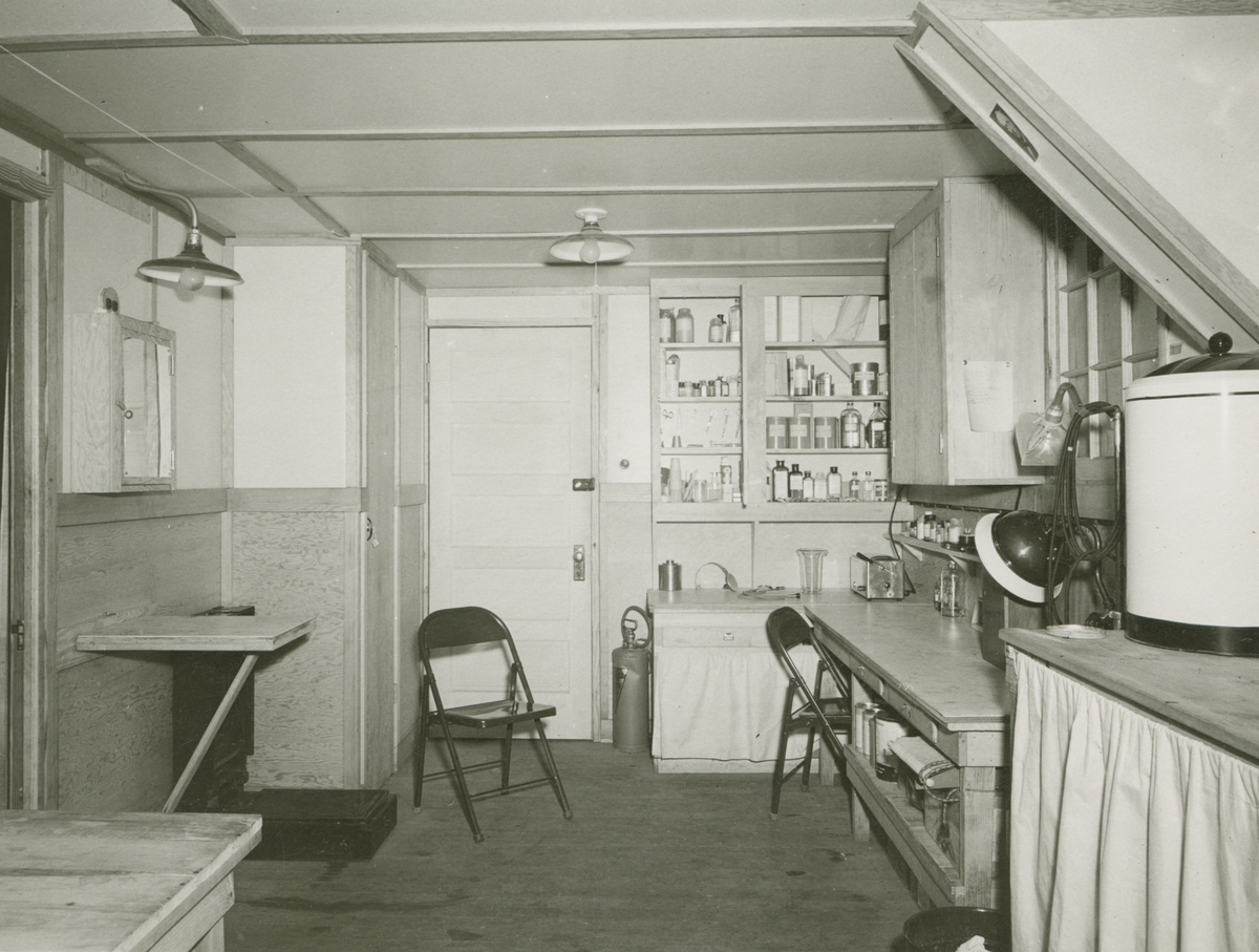 Fotografi från låda märkt Bernt Balchen. Balchen var norsk-amerikansk flygare, polarforskare och militär. Interiörbild från litet hus med stolar, brandsläckare, lampor, bord och hyllor.