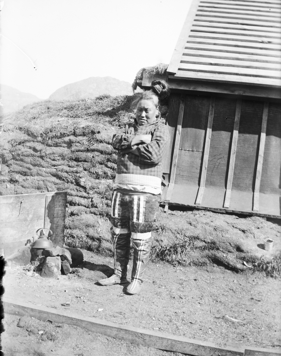 Fotografi från Grönland. Motiv av kvinna vid litet trähus.
