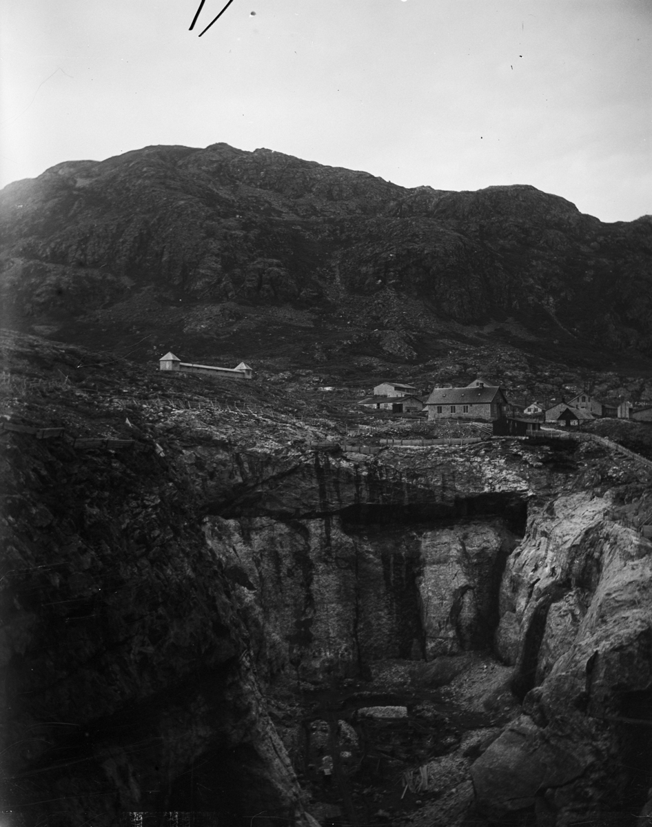 Fotografi från Grönland. Motiv av hus i bergslandskap.