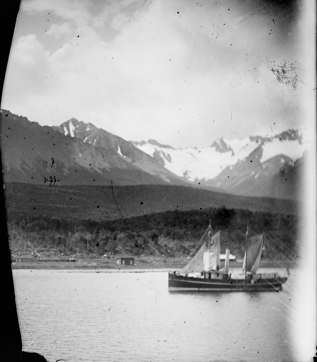 Fotografi från Eldslandet. Motiv av fartyg och snötäckt bergslandskap.