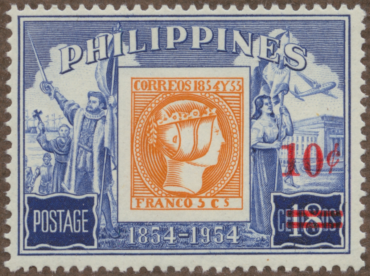 Frimärke från Philippinerna, 1954. Motiv av Drottning Isabella II Maghellan år 1522 och Monoplan, Philippinernas Frimärken 100 år: 1854-1954.
