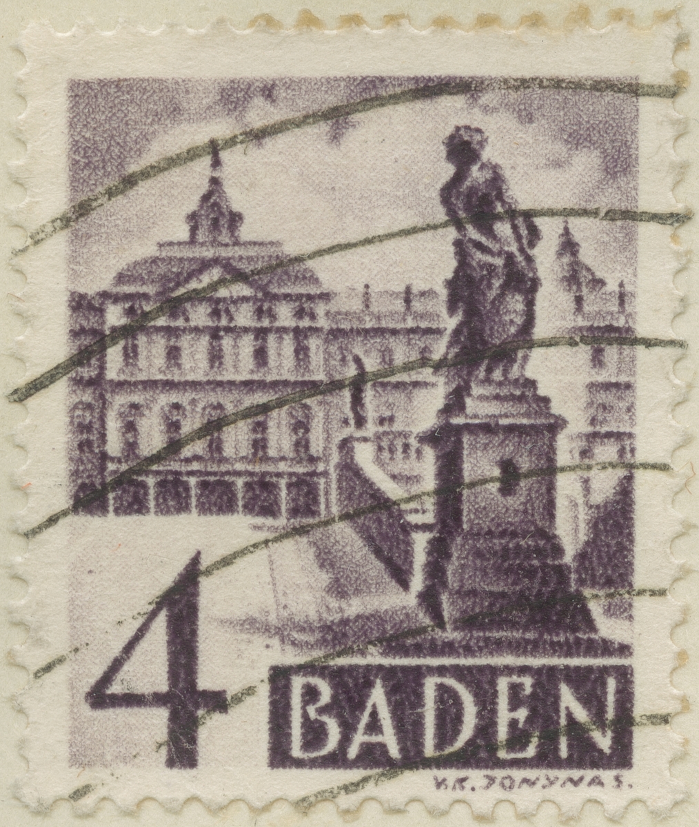 Frimärke från Baden, 1948. Motiv av Slottet i Rastatt med Monument