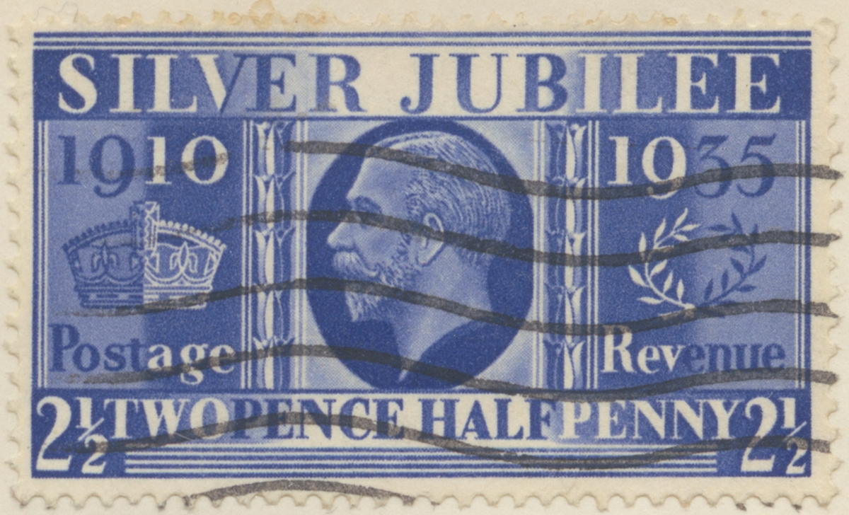 Frimärke från England, 1935. Motiv av Krona Silver Jubileum (mitten): Kung George V- -Minne av kungens 25-årsregerings jubileum: 1910-1935.