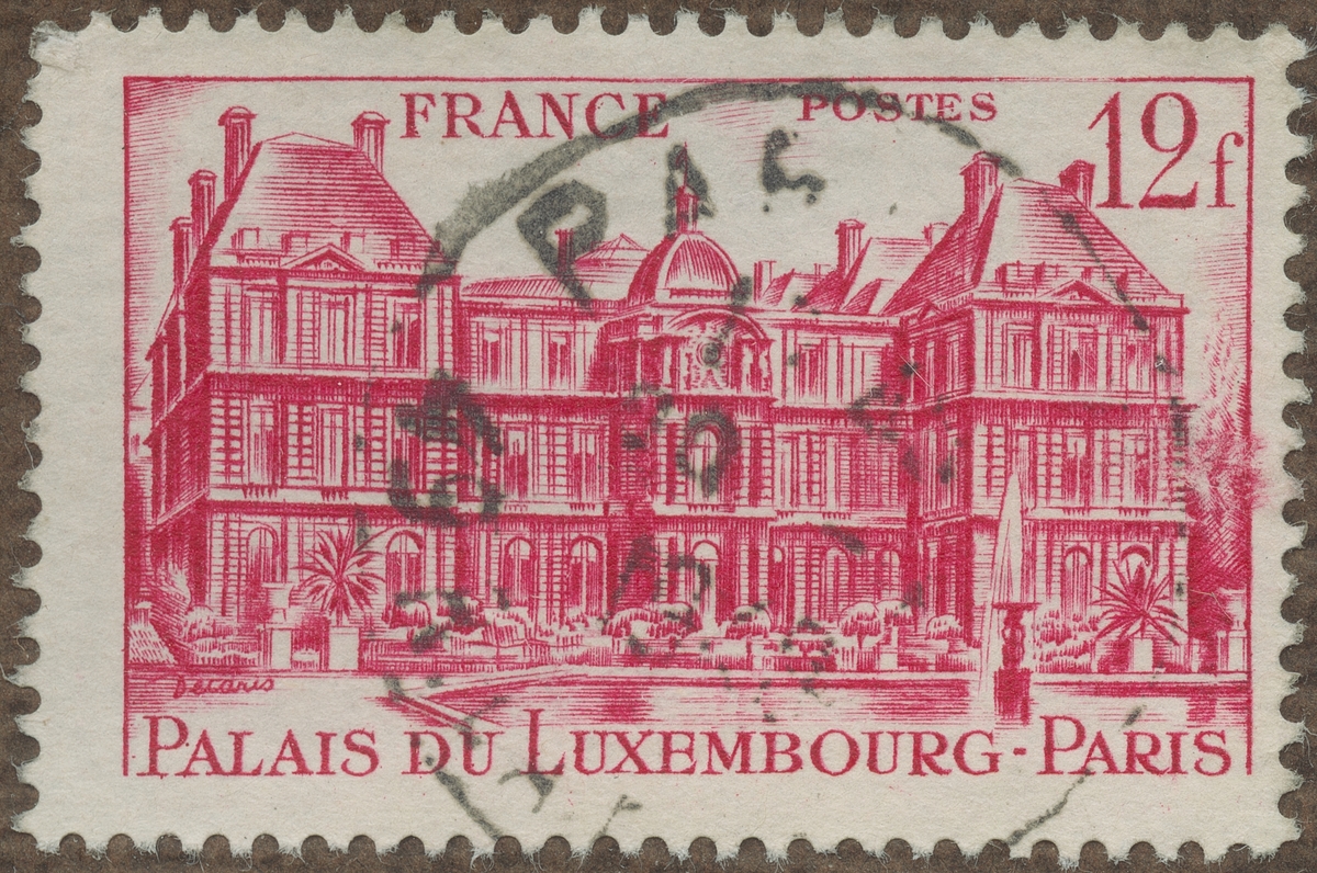 Frimärke från Frankrike, 1946. Motiv av Luxembourg Palatset i Paris Uppfört 1621 för Maria av Medici av arkitekten S. de Brosse