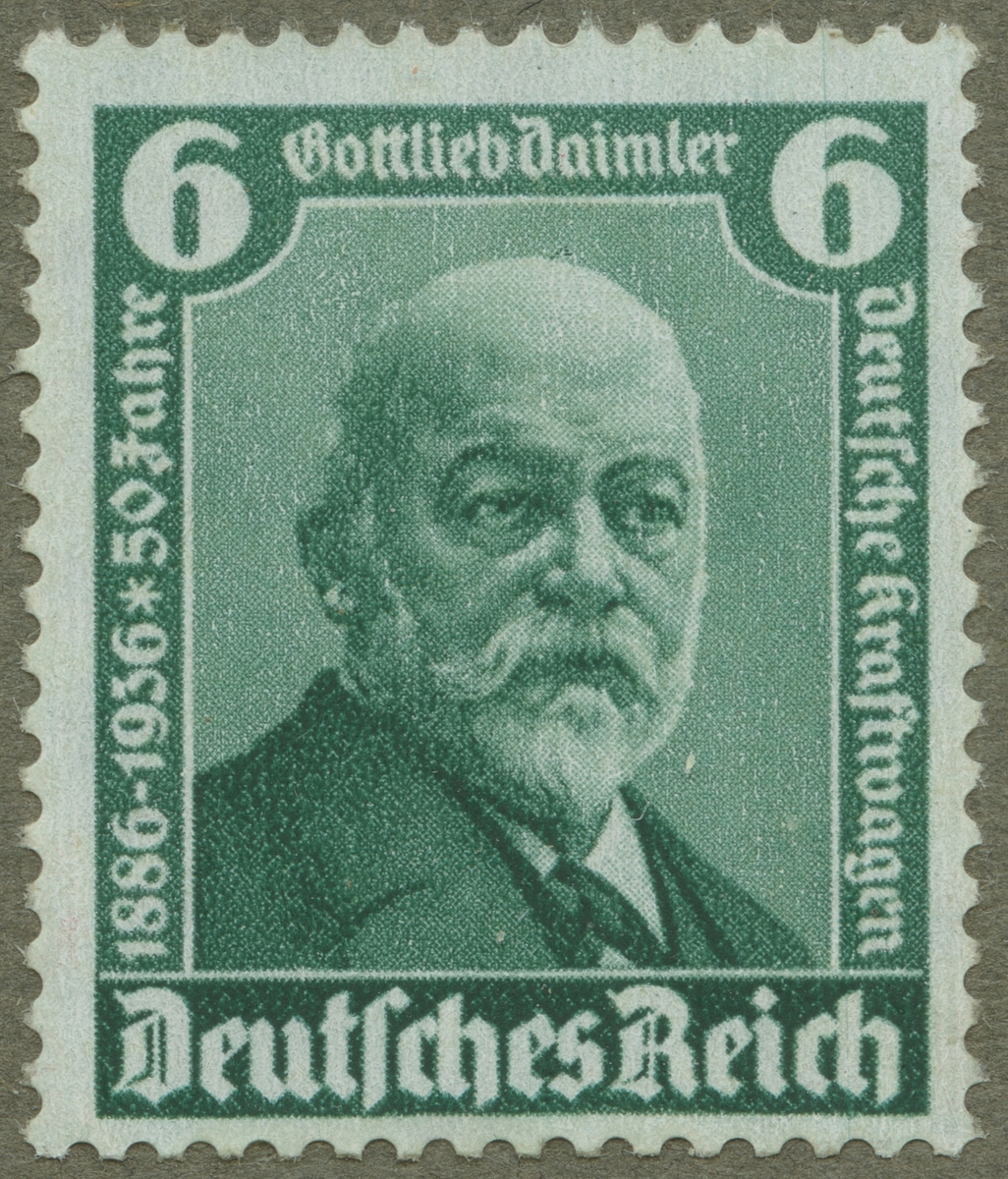 Frimärke från Tyskland, 1936. Motiv av Gottlieb Daimler 1834-1900. Tysk ingeniör. Byggde 1885-86 den praktiskt användbara bilen med bensinmotor. 50-årsminne av den tyska bilen. 1886-1936.