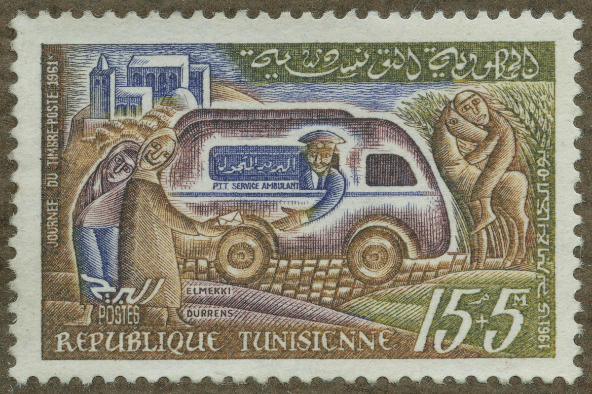Frimärke från Tunisien, 1961. Motiv av Tunisisk postbil i vetedistrikt: utlämning av post. "-Frimärkets Dag: 1961-"