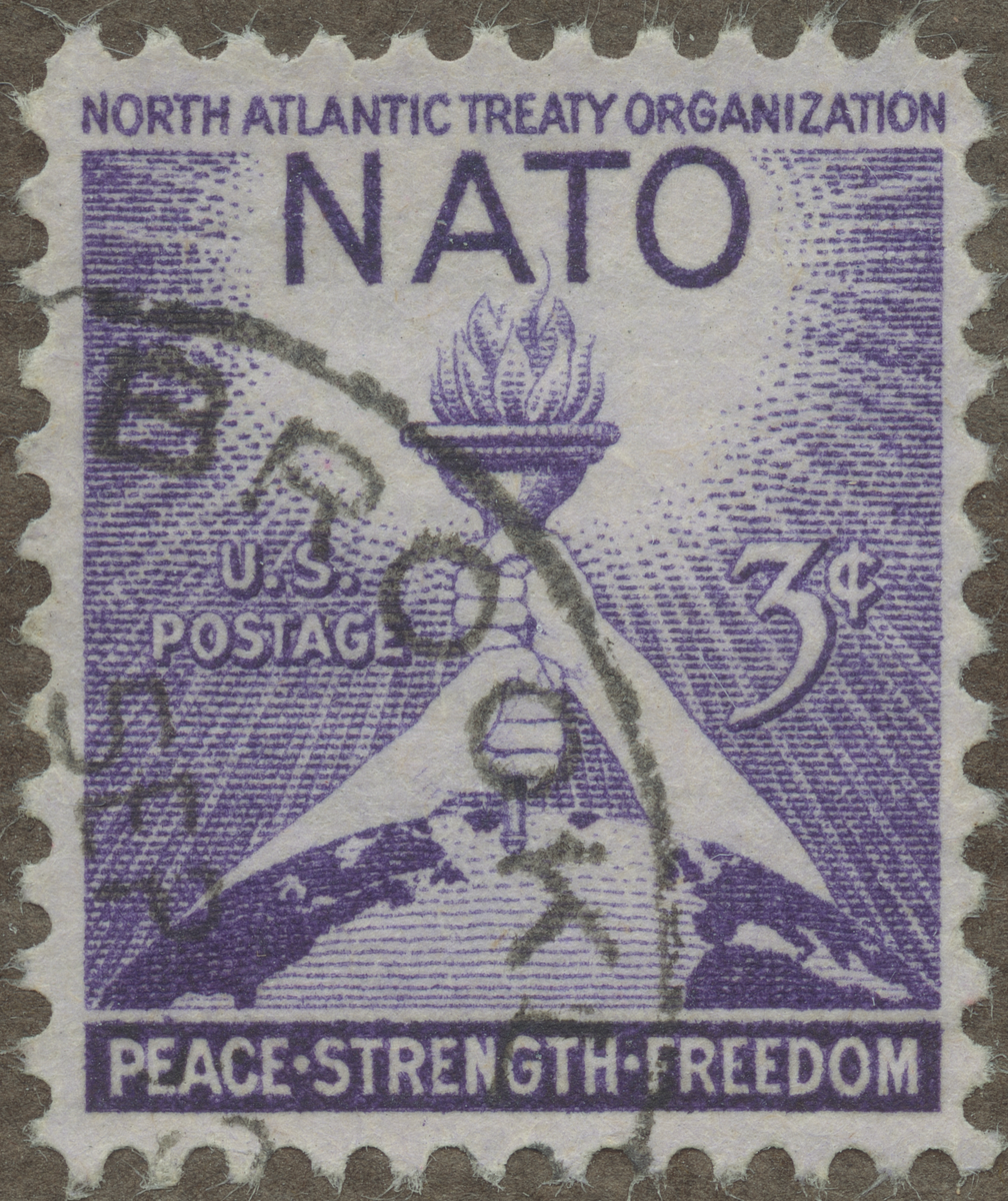 Frimärke från U.S.A., 1952. Motiv av Fackla över Nordatlanten Symbol för Atlantpakten: "N.A.T.O" Fred Styrke Frihet -3-årsminne av underskrivningen av Atlantpakten-