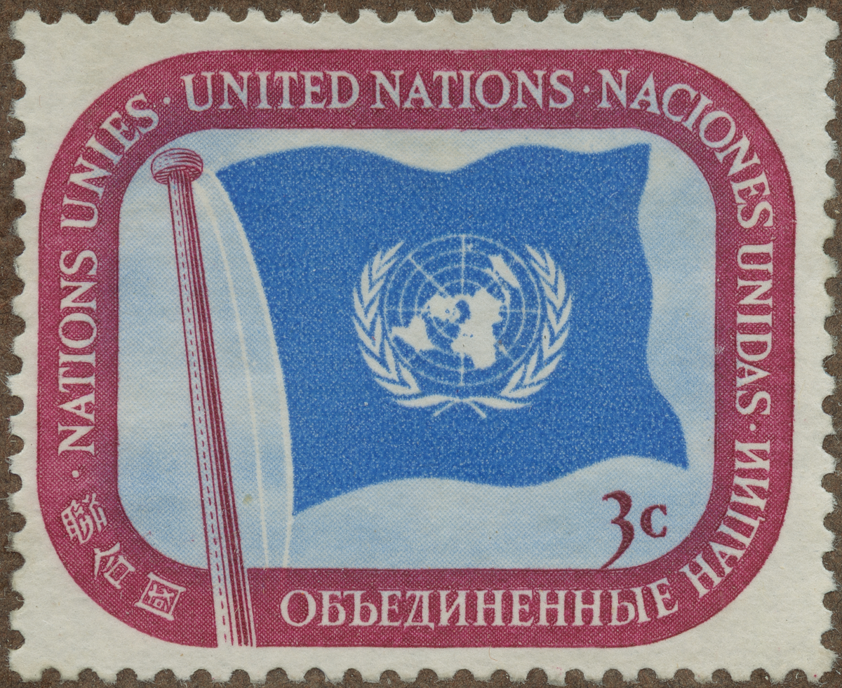 Frimärke från Nations Unies, 1951. Motiv av F N- flagga F N-märke