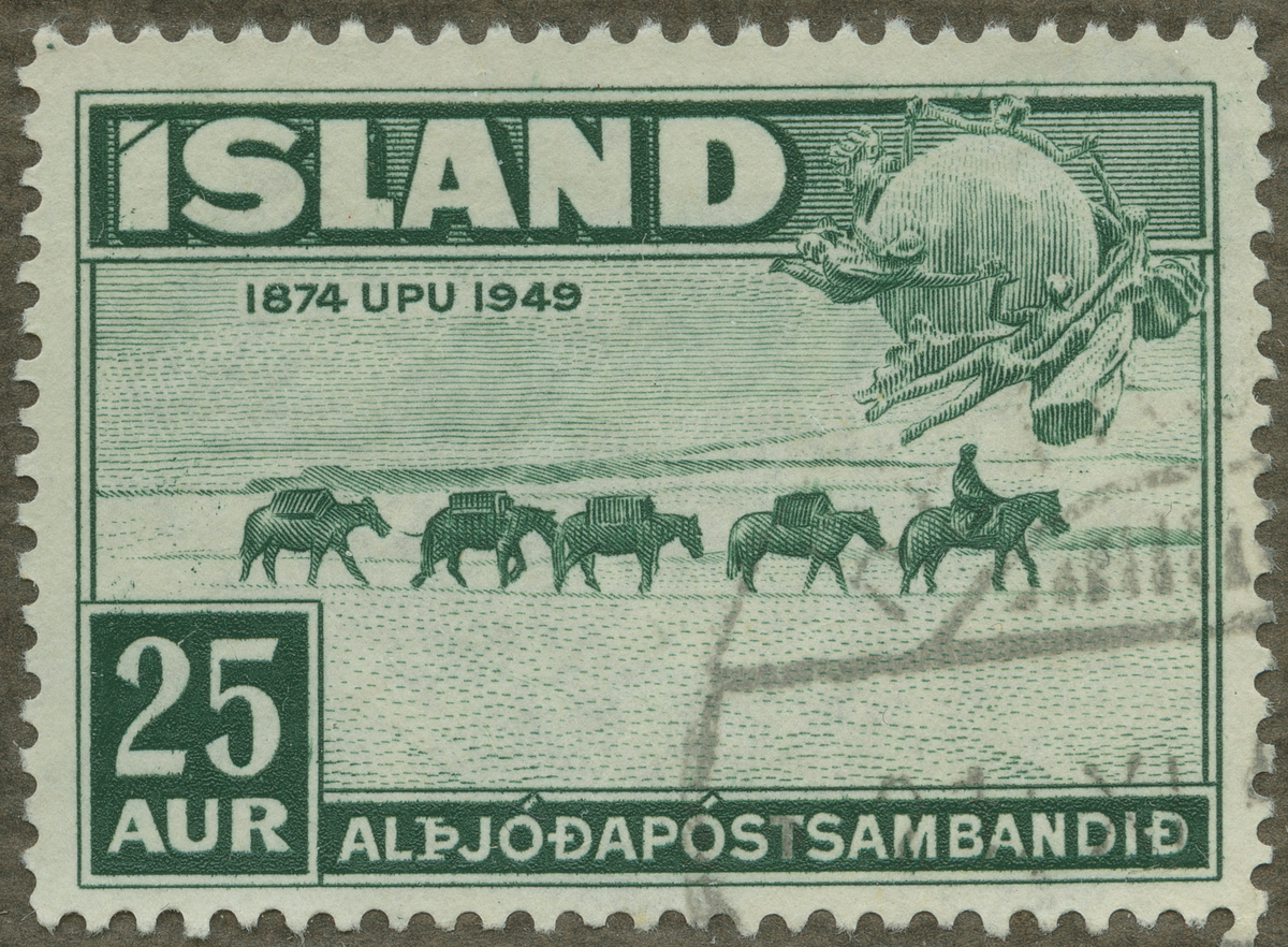 Frimärke från Island, 1949. Motiv av Hästkaravan på Island Internationella Postunionen 75 år 1874-1949.