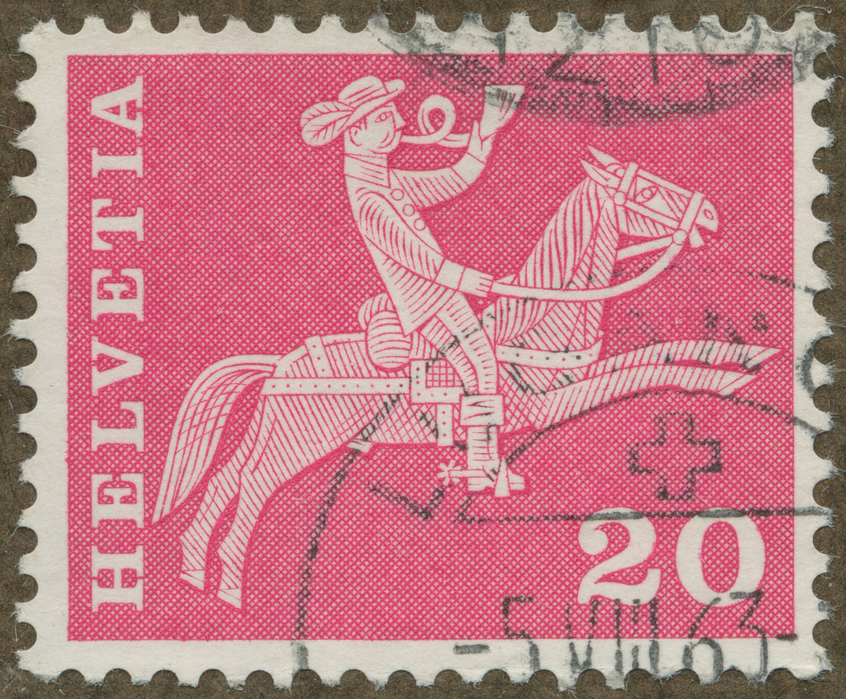 Frimärke från Schweiz, 1960. Motiv av Schweiz: Postryttare från 1800-talet