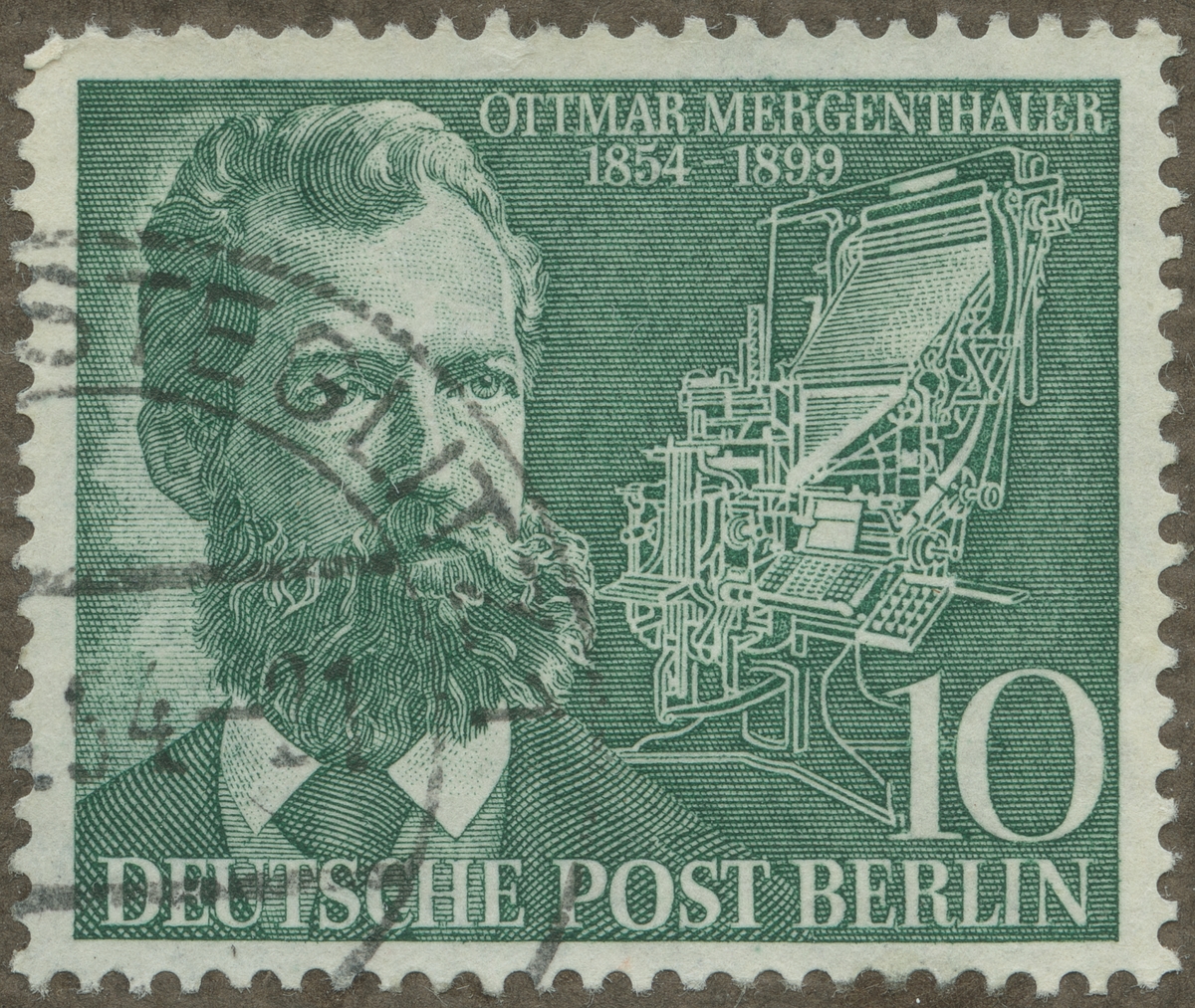 Frimärke från Tyskland, 1954. Motiv av Ottmar Mergenthaler 1854-1899. Uppfinnare av sätt-tryckmaskinen 100-årsminne av hans födelse. 1854-1954.