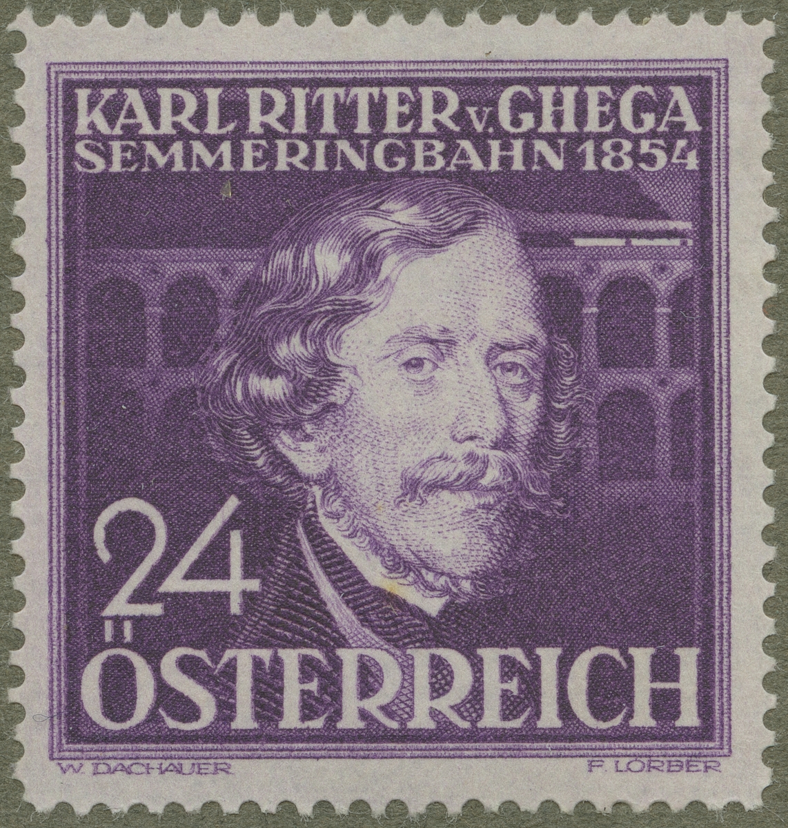 Frimärke från Österrike, 1936. Motiv av Karl Ritter von Ghega. Österrikisk ingeniör. Järnbanebyggare. Byggde den första banan över Alperna. Semmeringbanan 1848-1854. F. 1802-d. 1860.