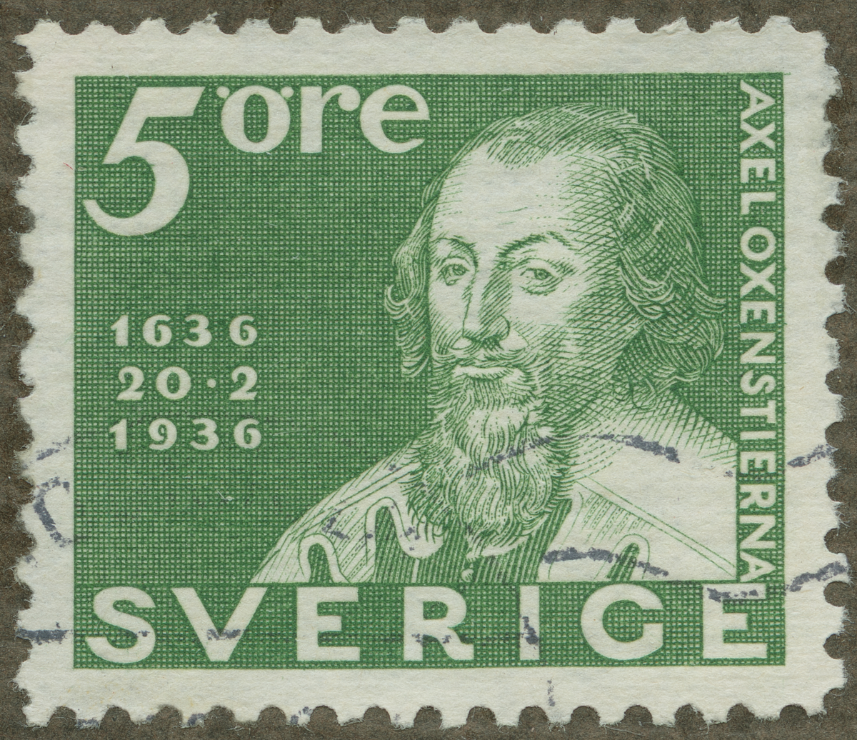 Frimärke från Sverige, 1936. Motiv av Axel Oxenstierna 1583-1654 Statsman Rikskansler Grundade det svenska postväsendet Postverket 300 år 1636-1936.