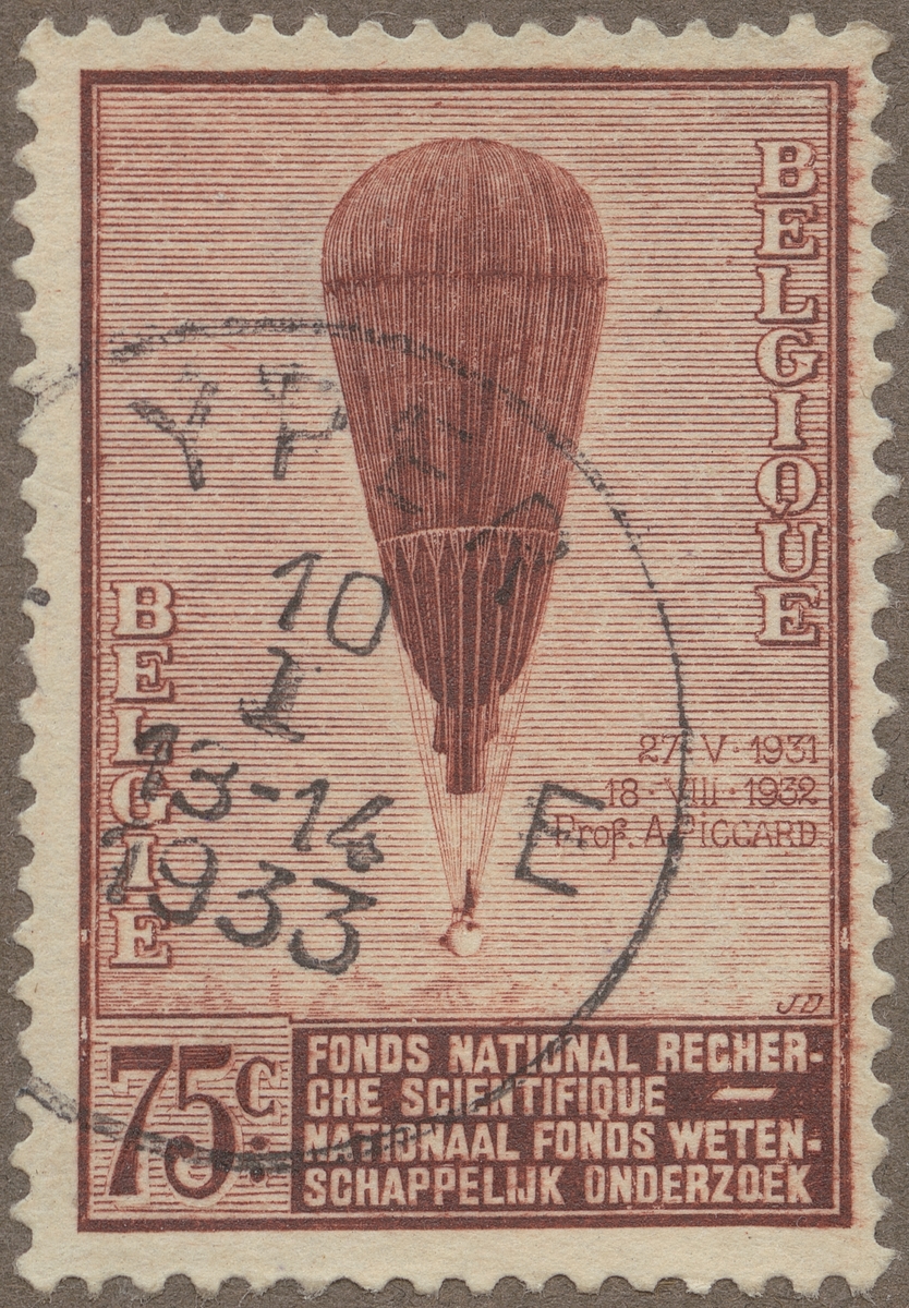 Frimärke från Belgien, 1932. Motiv av Stratosfärballong byggd av professor Auguste Piccard i Belgien. "Höjdfärd: 27.5.1931 (ca 16 000 m) Höjdfärd: 18.8.1932 (ca 16 700 m) -För Fonden för vetenskaplig forskning."