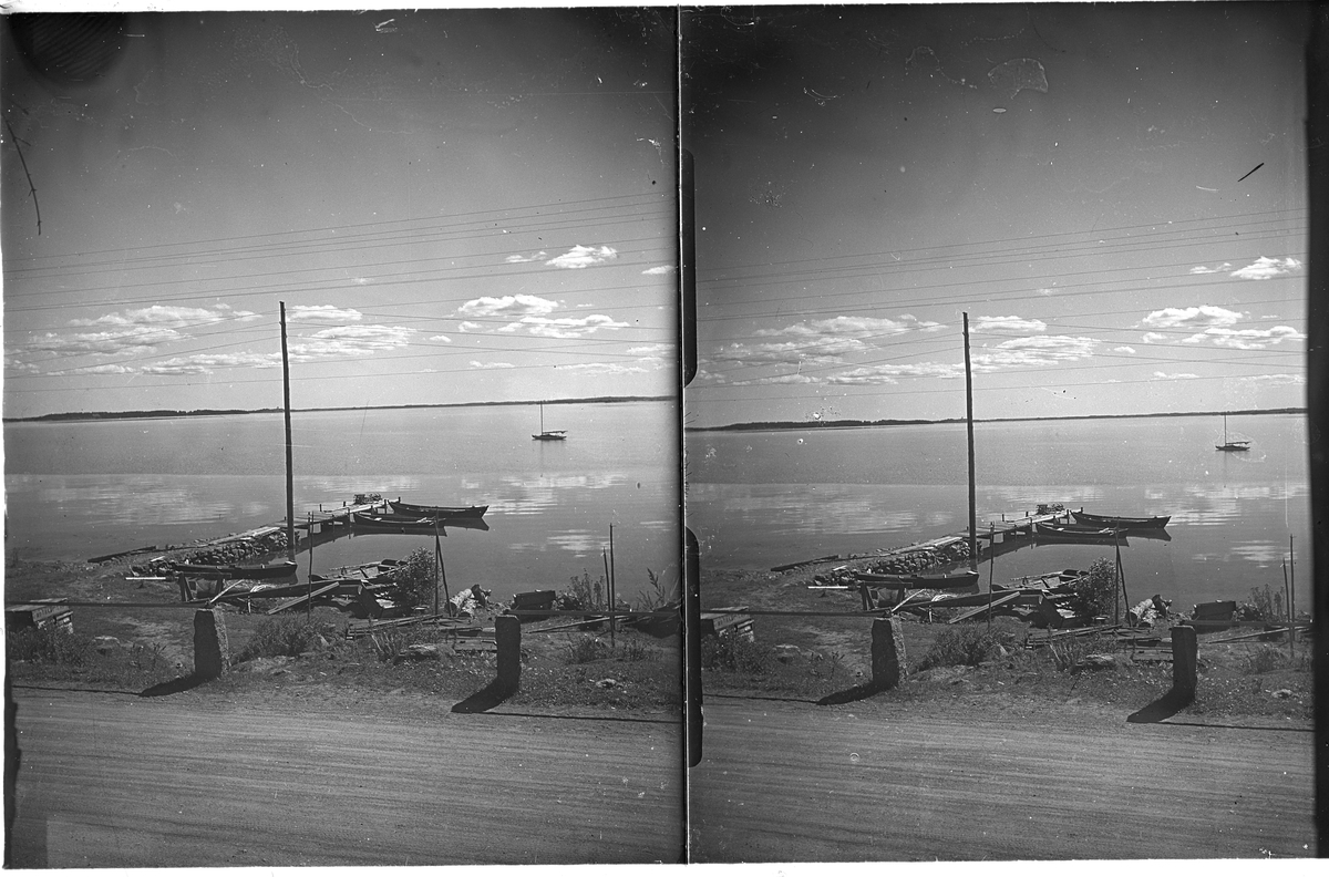 Stereonegativ med motiv av båtar vi liten brygga. Okänd plats.
