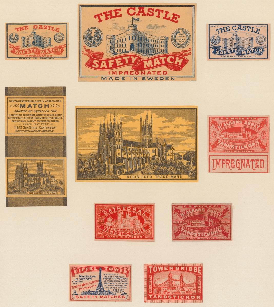 Etiketter för tändsticksaskar, från Svenskt Industri- och Handelsmuseum.