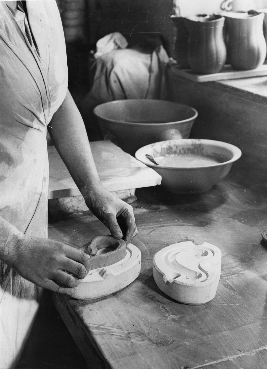 Gustavsbergs Porslinsfabrik. Större öron lägges i gjutform.