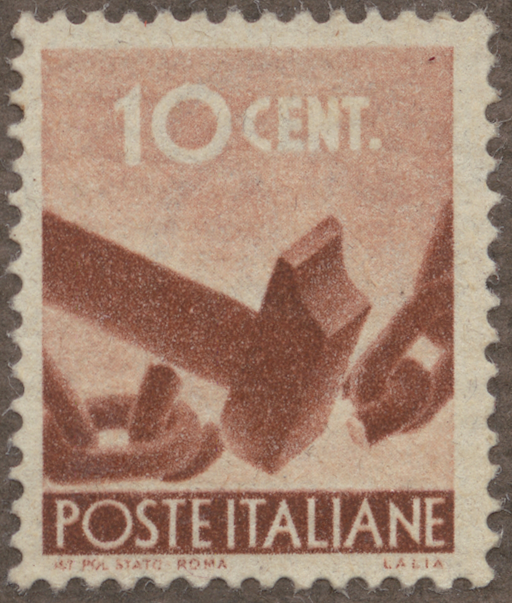 Frimärke från Italien, 1945. Motiv av Italiensk symbol för återuppbyggande. Metallarbete.
